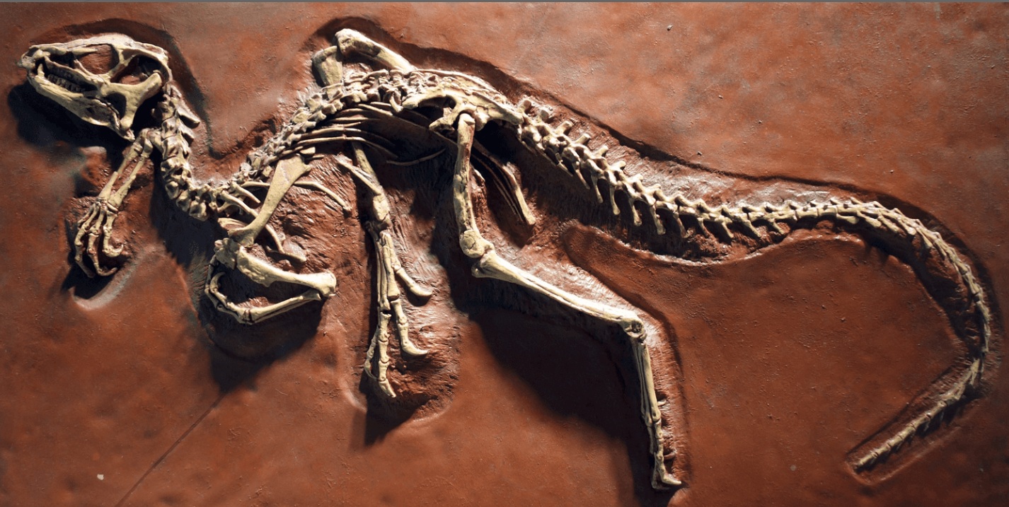 The beautiful southwestern desert, bathed in moonlight. The peaks of red stone cast eerie shadows. In the side of one cliff, an embedded T-Rex skull glows white under the full moon.